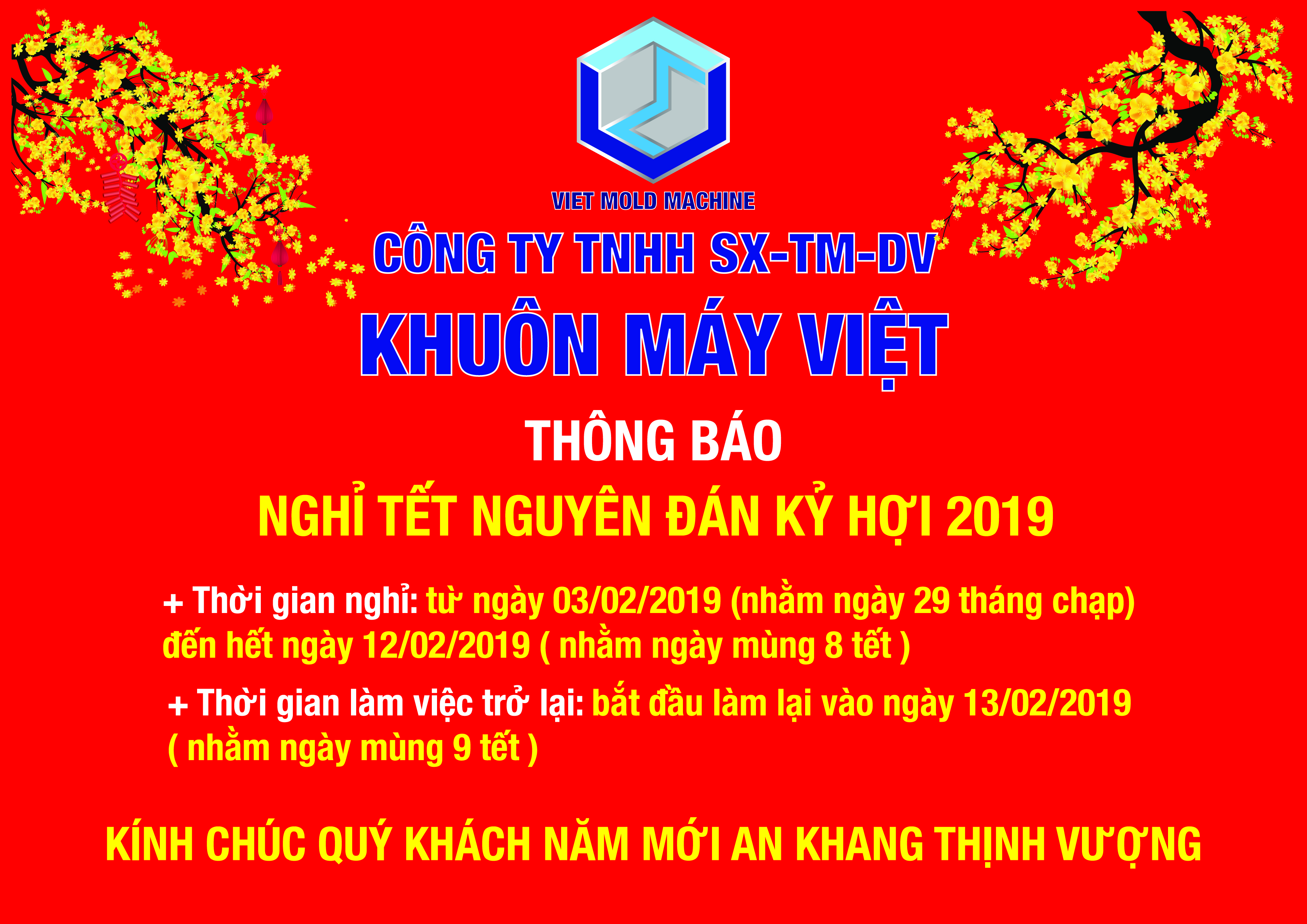 Công ty TNHH Sản xuất - Thương mại - Dịch vụ Khuôn Máy Việt xin thông báo lịch nghỉ Tết Nguyên Đán Kỷ hợi 2019 của công ty chúng tôi như sau: